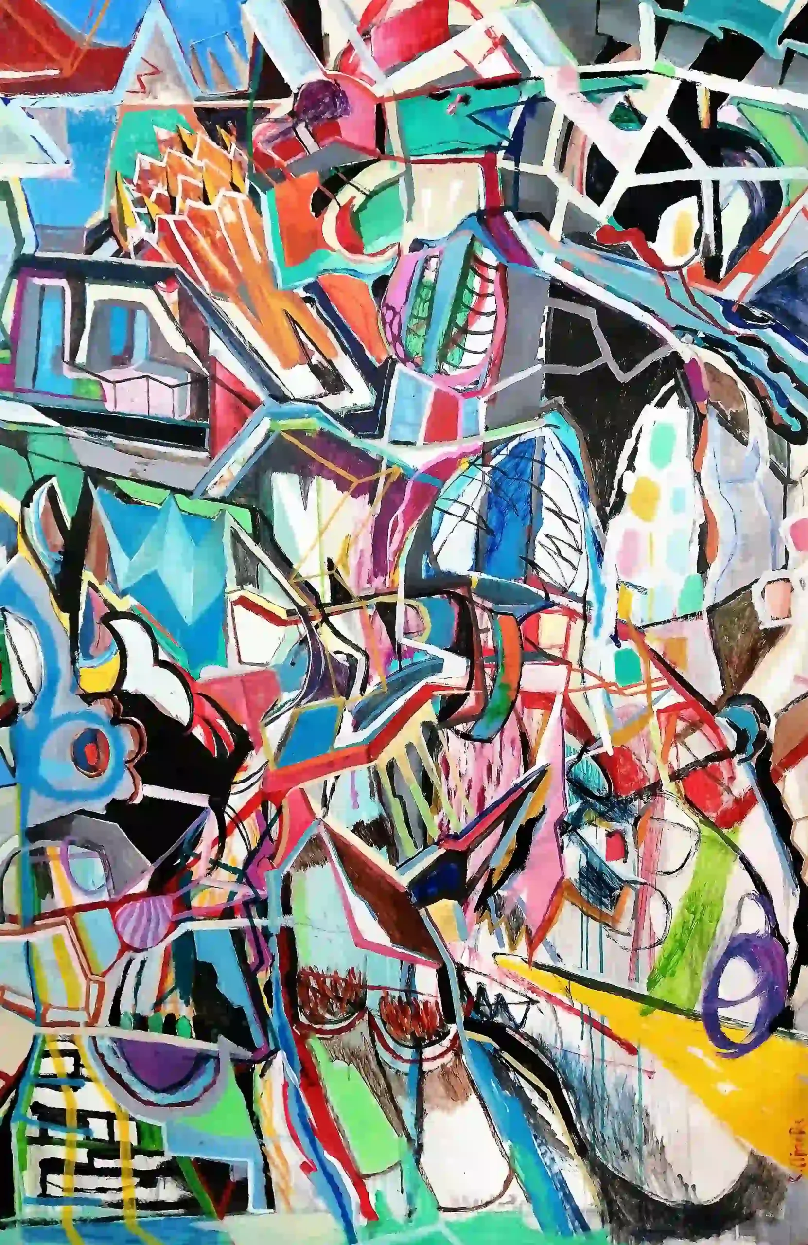 Serie inspirada en los muros y paredes invadidos por grafitis y carteles arrancados, imágenes que se superponen formando una amalgama cromática y gestual, los colores primarios y la saturación espacial del lienzo son una constante, dentro de un aparente caos compositivo.